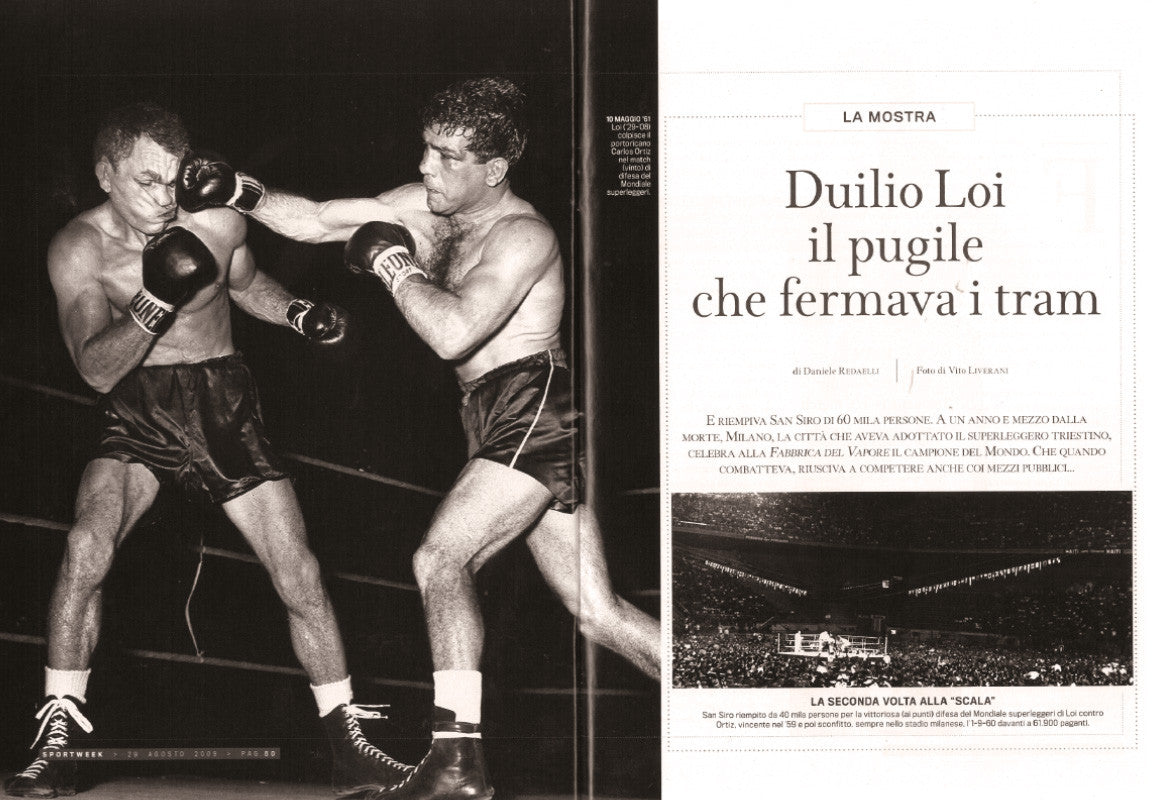 "It is the evening of September 1, 1960, the S. Siro stadium crowds. Over 60,000 boxing fans have met in the large Milanese stadium, usually located for football, to support their idol Duilio Loi, the most popular boxer of the Italy ever. The Italian tries the big feat, that of ousting the world welterweight title jr. As indicated in those years, now super light, the Puerto Rican Carlos Ortiz, a champion with a capital C, who three months earlier at the Cow Palace of San Francisco had kept the belt with a decidedly disputed majority (2-1). The day before in Rome, the Olympic boxing finals ended, with an extraordinary balance: three golds (Musso, Benvenuti and De Piccoli ), three silvers (Zamparini, Bossi and Lopopolo), a bronze (Giulio Saraudi). Italy in gloves is doing great and after the Olympic triumphs, he hopes to complete the budget by relying on the boxing genius of Loi. Milan is for this boxer born in Trieste from a Sardinian father, raised in Genoa and launched in the firmament of Milan, by SIS, the company directed by Vittorio Strumolo and Giovanni Busacca, with the support of Steve Klaus called 'la Volpe' (The Fox), born in the USA, a great connoisseur of the sector who after leading the Hungarian national team takes up the blue one until the eve of Rome, leaving it to Natalino Rea, to devote himself to the professionalism of our home. Behind the Milanese event, there is his hand. He convinced Ortiz to fight in Italy. Masterful blow, Loi in turn, makes a real masterpiece, beating the Puerto Rican, even knocking him out. Not only that, he also repeated the success in the beautiful race held on May 10 of the following year, always in Milan and always in S. Siro, again forcing Ortiz to count in the sixth round and ending up a clear winner on points.