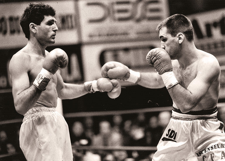 Left. A moment of the legendary challenge between two great champions: Sandro Mazzinghi (left) and Nino Benvenuti. The world super welterweight belt is up for grabs, won twice in the same year (1965) by Benvenuti.Top Right. Francesco Damiani (left) wins the European EBU title in the heavyweight category by beating the Swedish Anders Eklund (Palaghiaccio - Aosta 1987). Bottom Right. Patrizio Oliva defends the European welterweight belt by beating French Antoine Fernandez on points (San Pellegrino Terme 1992).