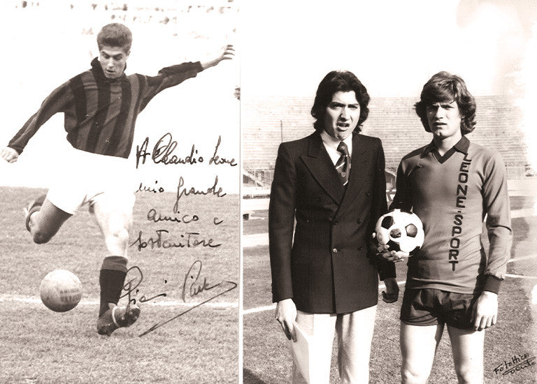 "To Claudio Leone my great friend and supporter" signed Gianni Rivera, historic Milan player and vice-world champion in 1970 with the Italian national team. Claudio himself with the world champion Giancarlo Antognoni, sponsored by Leone Sport.