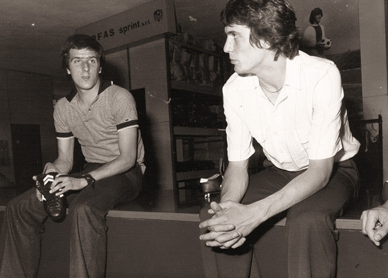 Right. The world champion (Spain 1982) Giancarlo Antognoni, sponsored by Leone Sport. Left. Giovanni Trapattoni, one of the most representative technicians of Italian football after the Second World War, comments on the shoe produced by Leone.